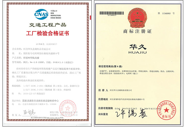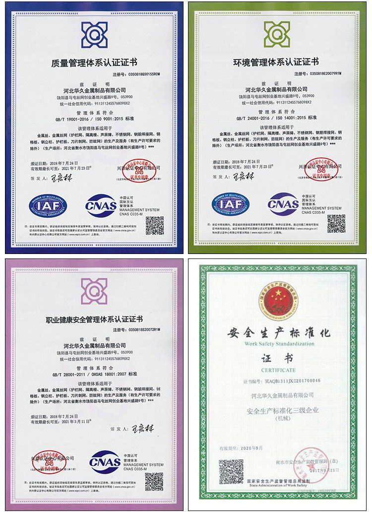 河北華久金屬制品有限公司近年來(lái)先后承接參與了2008年北京奧運(yùn)會(huì)鳥(niǎo)巢、水立方圍網(wǎng)項(xiàng)目、2009年國(guó)慶閱兵隔離欄項(xiàng)目、2010年新加坡青年奧運(yùn)會(huì)圍欄工程、2014年京石高速改擴(kuò)建工程聲屏障項(xiàng)目、2016年京新高速隔離網(wǎng)、防眩網(wǎng)工程、2017年京滬高速聲屏障工程等等一系列國(guó)內(nèi)外重大項(xiàng)目。